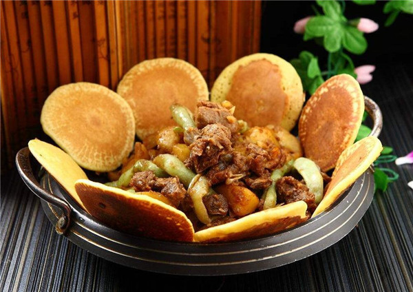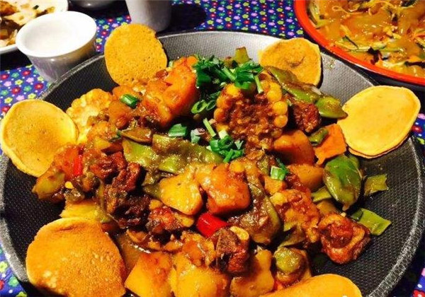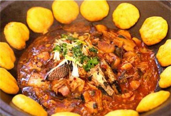 “一锅出”,很奇怪的名字,原来就是“主菜和主食放在一起上桌”的意思。锅里又炖菜又烀饼子,菜炖在锅底,饼子贴在锅边。东北的农家一锅出是用铁锅明火上桌,体现了东北人豪放的性格。多数一锅出里有排骨、油豆角、土豆块,铁锅的四周贴上玉米面的饼子。用料十分丰富,味道也一样,豆角绿绿的,绵而不过烂,土豆块已经到了被炖得没有任何棱棱角角的状态,入口即化,而吸收了青菜香味的排骨,味道让人回味悠长。