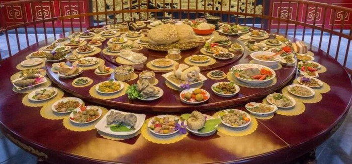 满汉全席,清朝时期宫廷盛宴。既有宫廷菜肴之特色,又有地方风味之精华;突出满族与汉族菜点特殊风味,烧烤、火锅、涮涮锅几乎不可缺少的菜点,同时又展示了汉族烹调的特色,扒、炸、炒、熘、烧等兼备,实乃中华菜系文化的瑰宝和最高境界。满汉全席原是清代宫廷中举办宴会时满人和汉人合做的一种全席。满汉全席上菜一般至少一百零八种(南菜54道和北菜54道),分三天吃完。满汉全席菜式有咸有甜,有荤有素,取材广泛,用料精细,山珍海味无所不包。